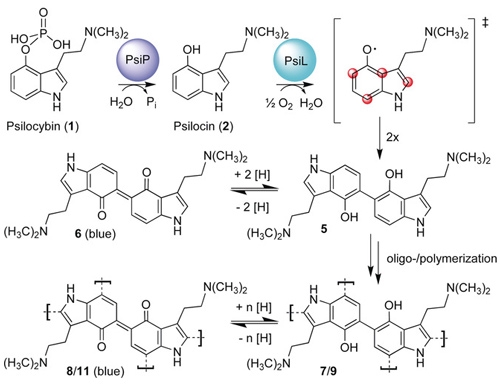 A second enzyme, imaginatively named "PsiL" then steals an electron from the psilocin. This causes the psilocin molecules to stick together. These larger psilocin molecules can then lose a hydrogen atom, creating blue substances in magic mushrooms. Are you getting dizzy already? Maybe the following diagram will make it easier for you: